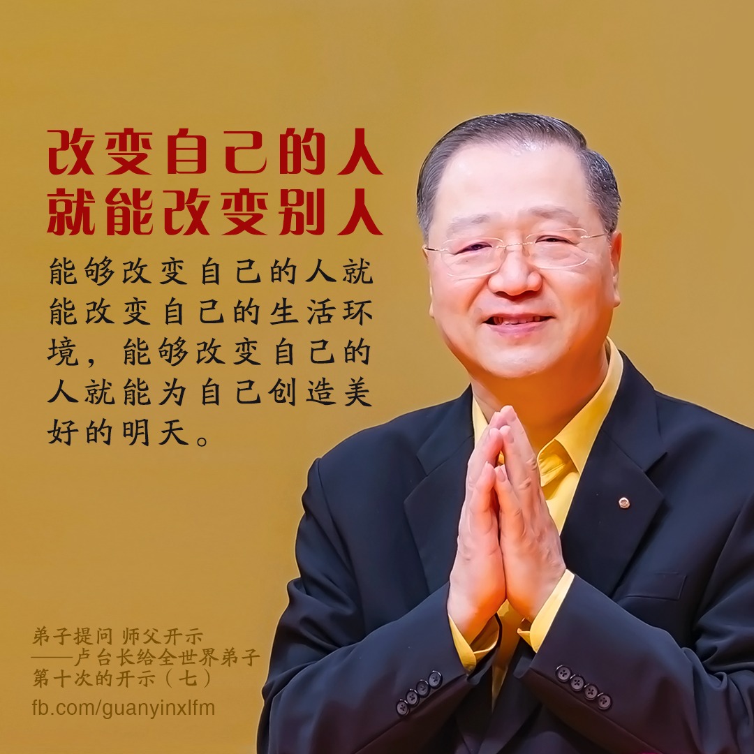 改变自己的人,就能改变别人 ; 能够改变自己的人就能改变自己的生活环境, 能够改变自己的人就能为自己创造美好的明天。 --弟子提问 师父开示 —卢台长给全世界弟子第十次的开示(七)